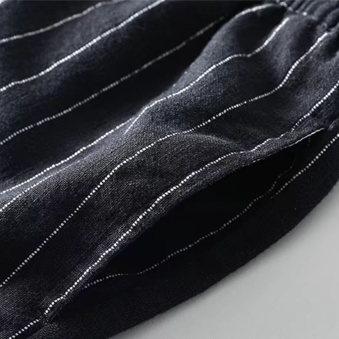 Cut from breathable linen, the crisp vertical stripes bring structure and length to the relaxed silhouette. An elastic waistband meets a thick rope drawcord for casual refinement.