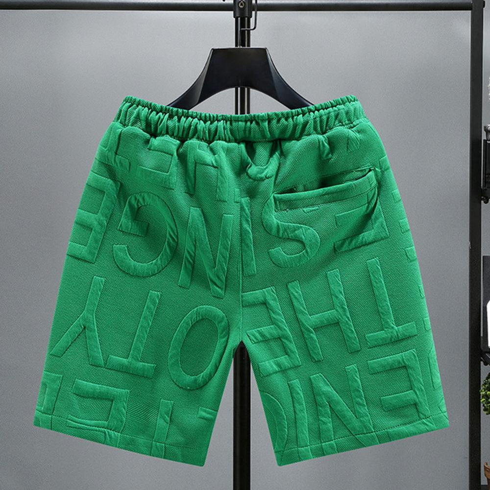 Stretch double‑knit fabric is jacquard‑woven with a raised text pattern, giving the surface depth without adding weight. An elastic drawcord waistband and soft interior keep the fit easy, while clean above‑knee hems and deep pockets.
