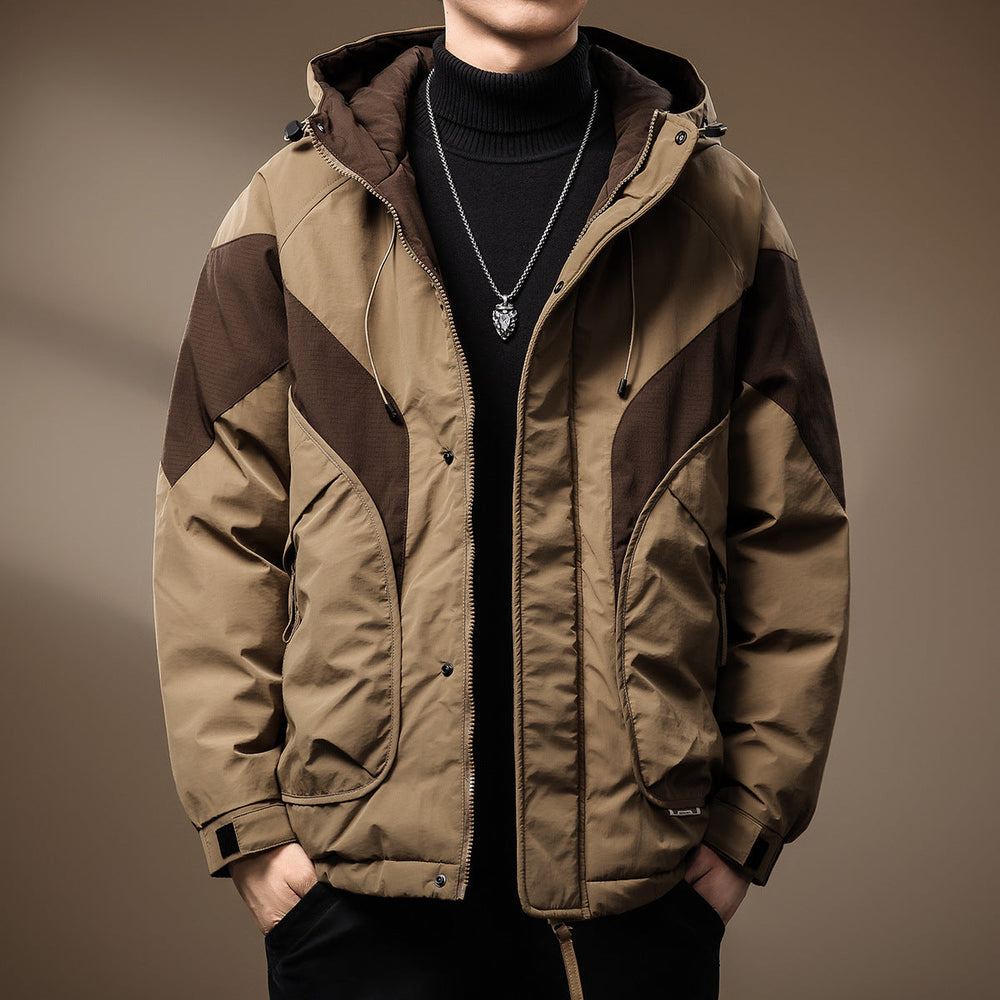 The bold two-tone design adds style, while the lightweight yet insulated fabric ensures comfort during colder days. An adjustable hood and zippered front closure lock in warmth, and multiple pockets make it easy to stash your essentials.