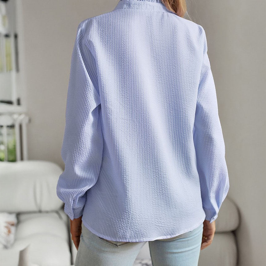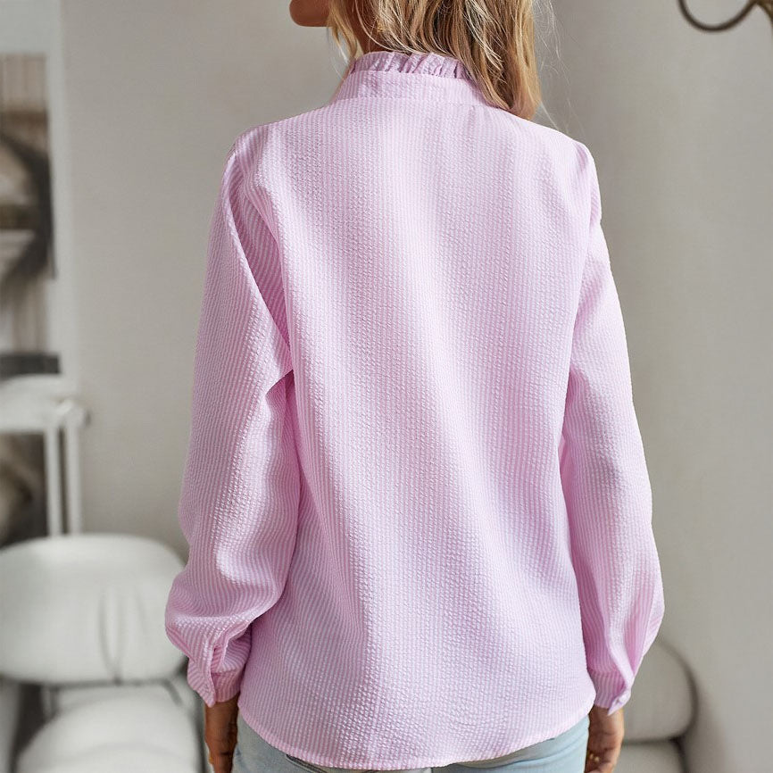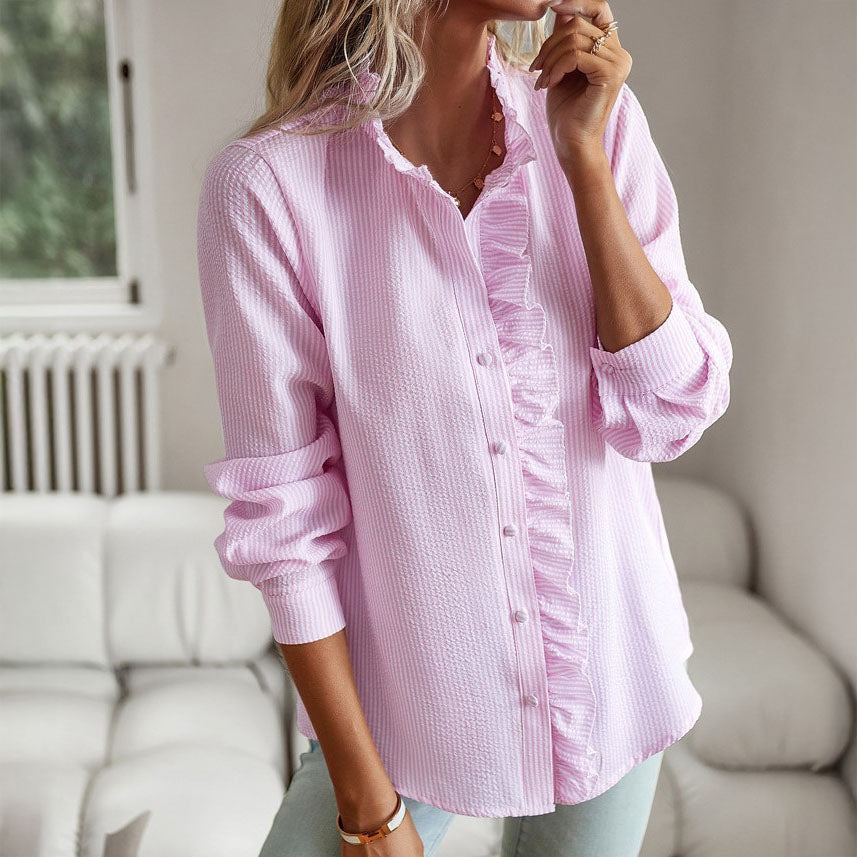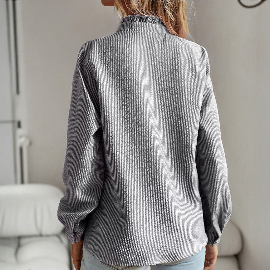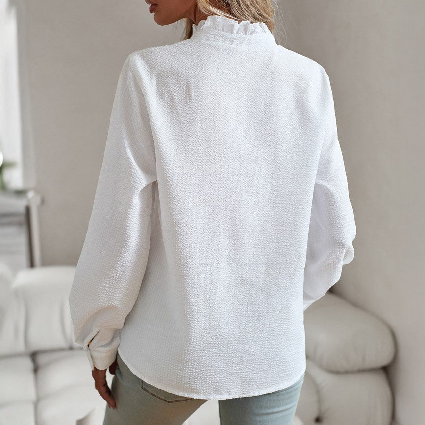 A lightly structured weave resists wrinkling while holding its shape through movement and wear. Ruffled trim and precise tailoring lend visual texture without compromising ease.