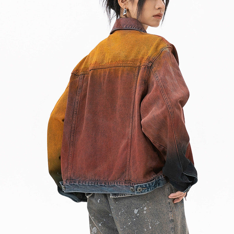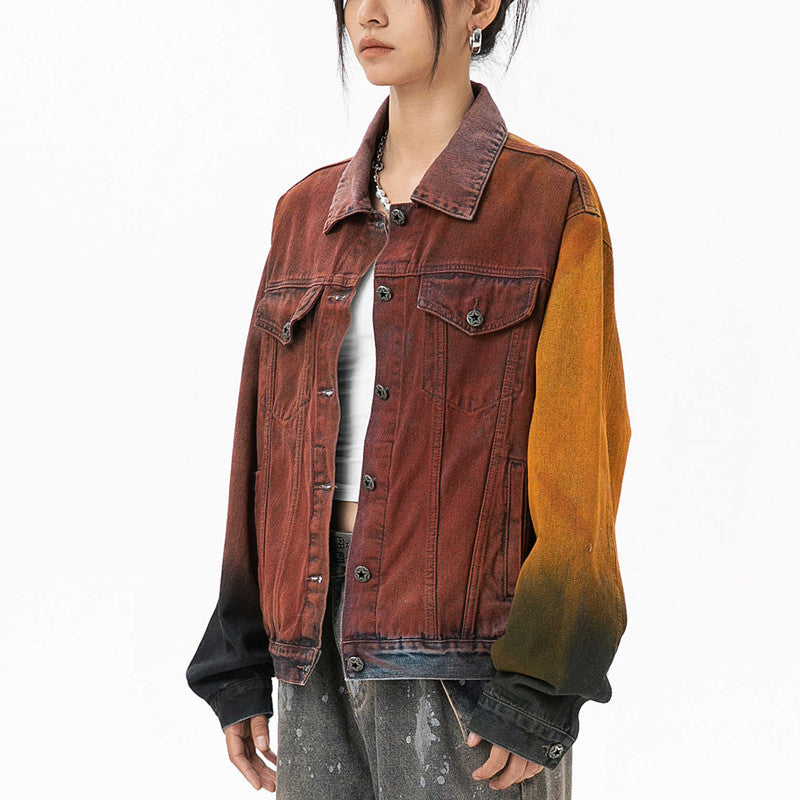 This jacket brings bold energy to your wardrobe with its striking ombre gradient and oversized fit. Crafted from durable cotton denim, it’s the perfect mix of vintage vibes and modern style. The cropped length and utility-inspired details make it a go-to for effortless layering.