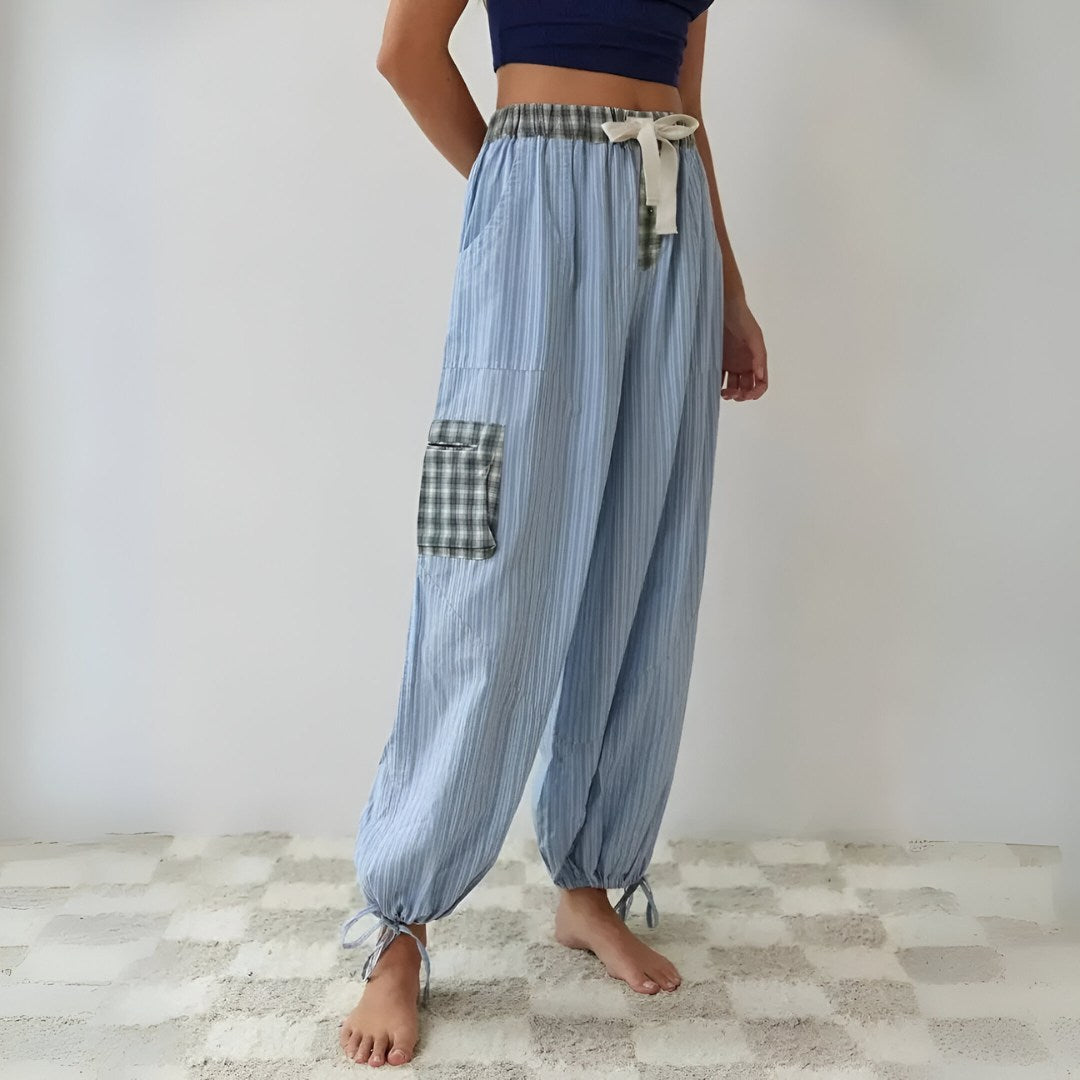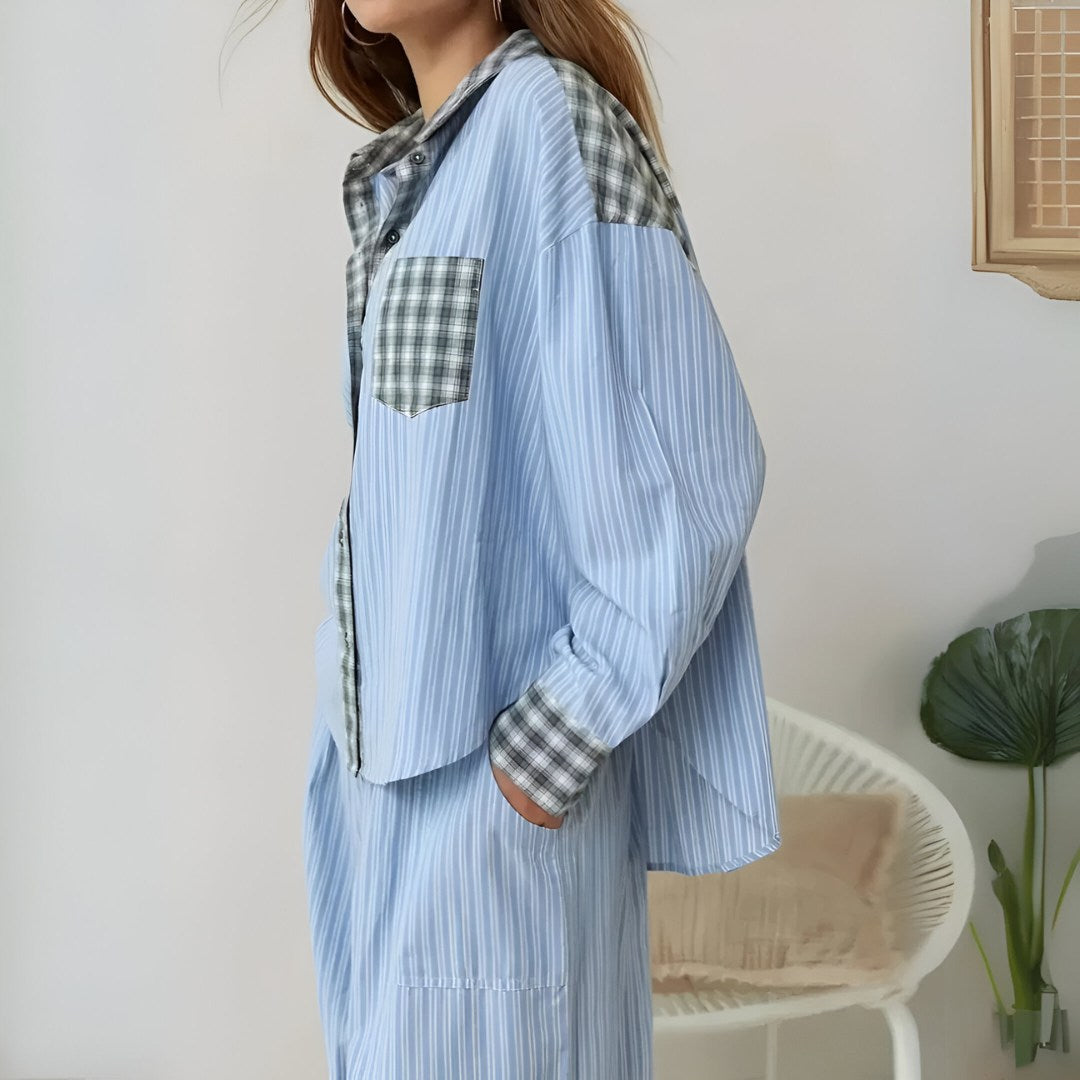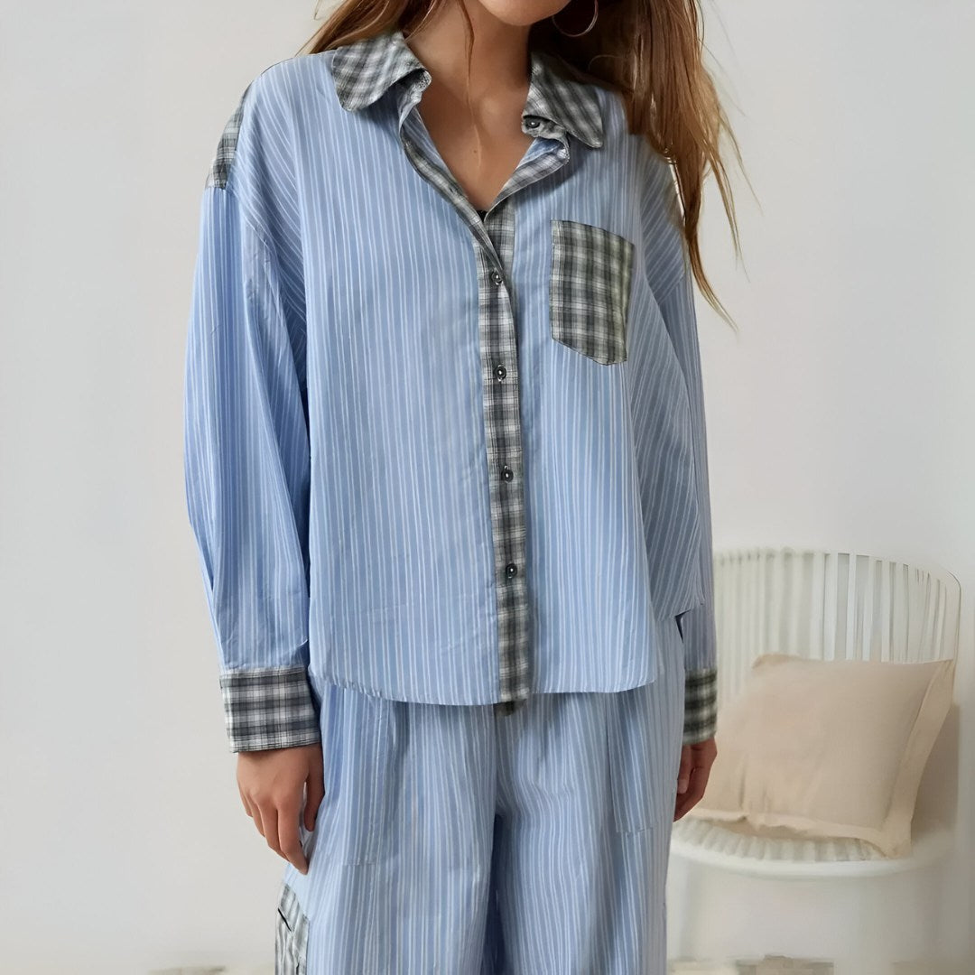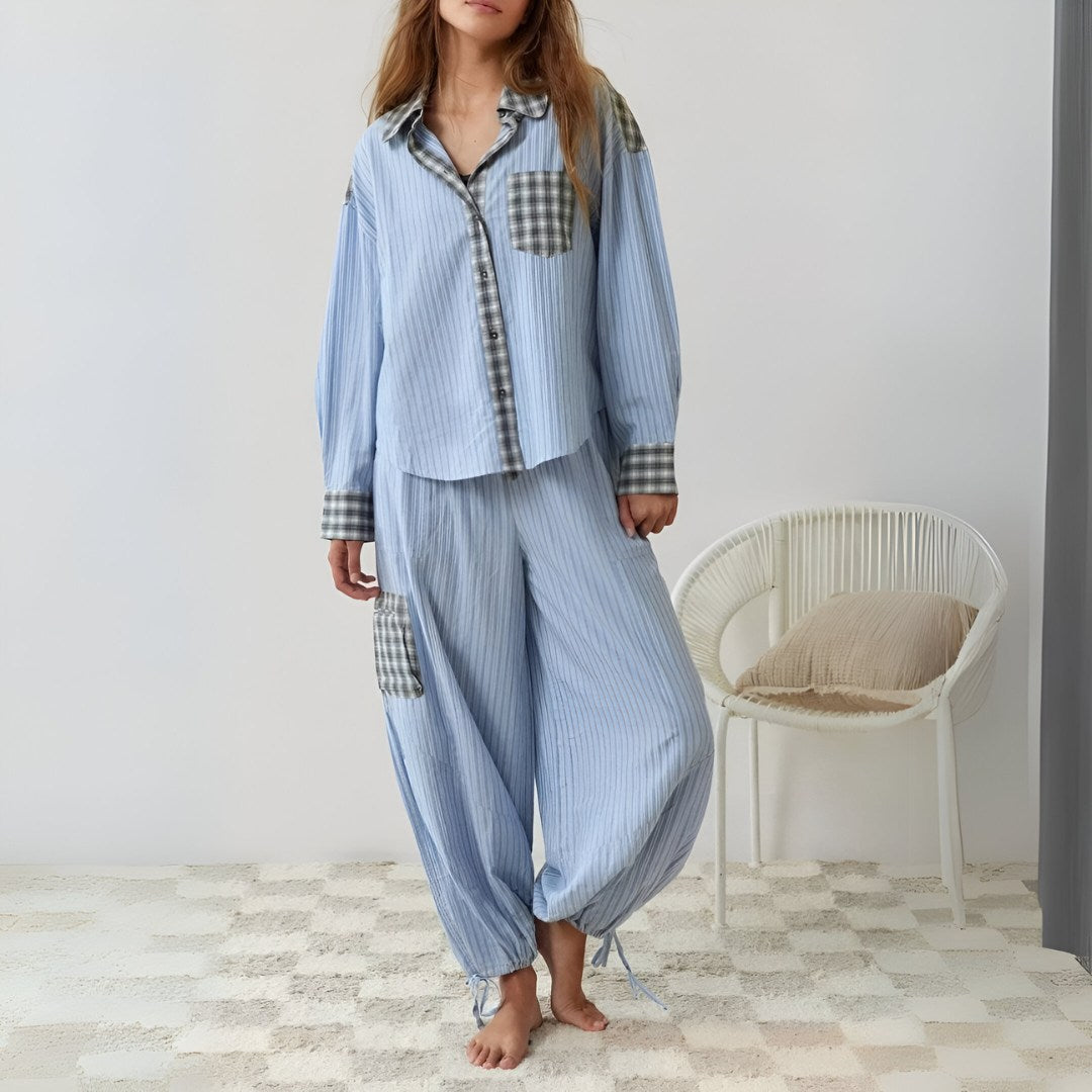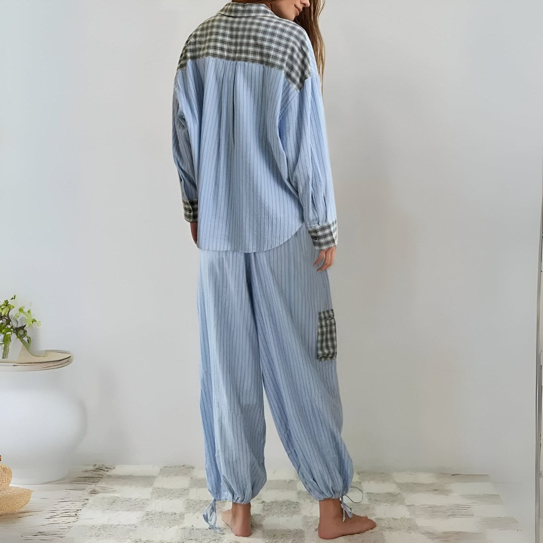 Precision-woven cotton with a soft brushed finish and airy structure for breathable comfort. Features a relaxed button-up shirt and wide-leg drawstring pants with gathered cuffs for a cozy silhouette.
