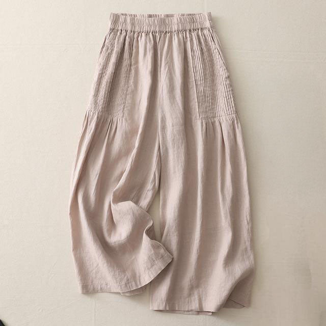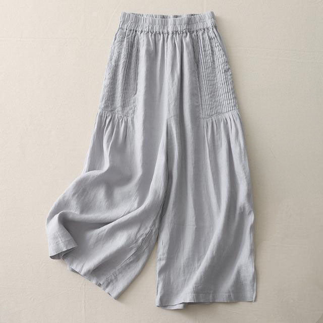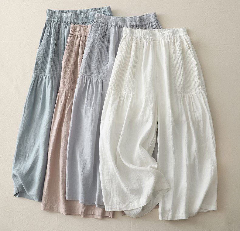 Lightweight summer cloth floats in a generous culotte cut, finished with fine pintuck panels that shape the hip without slowing the drape. An elastic pull‑on waistband keeps the fit easy, while the wide mid‑calf leg catches every breeze.