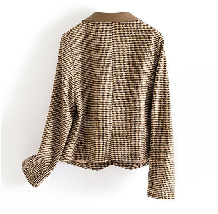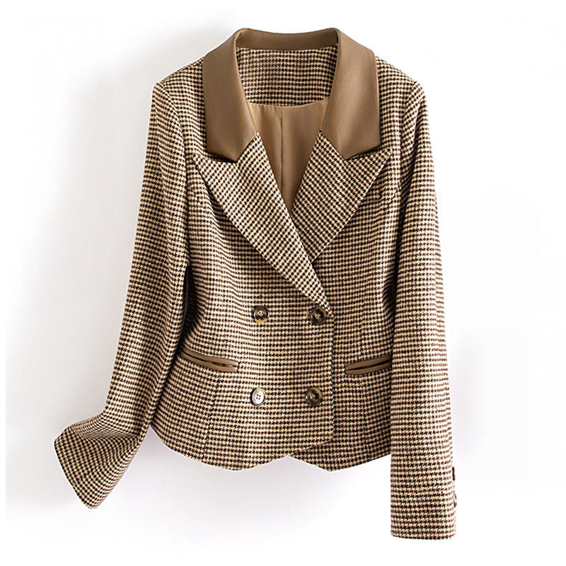 A sharp double-breasted cut offers structure and protection against cold and wind. The wool blend fabric provides warmth, while smooth leather trim defines the lapel and pocket edges with precision.