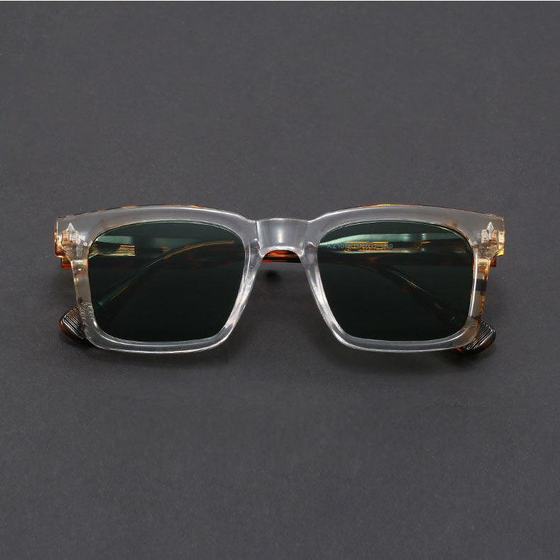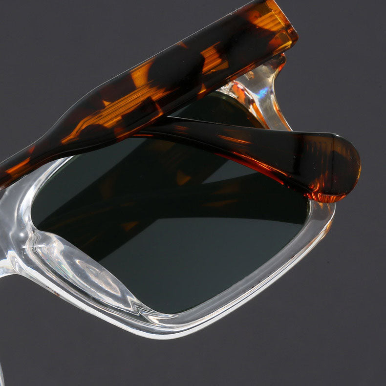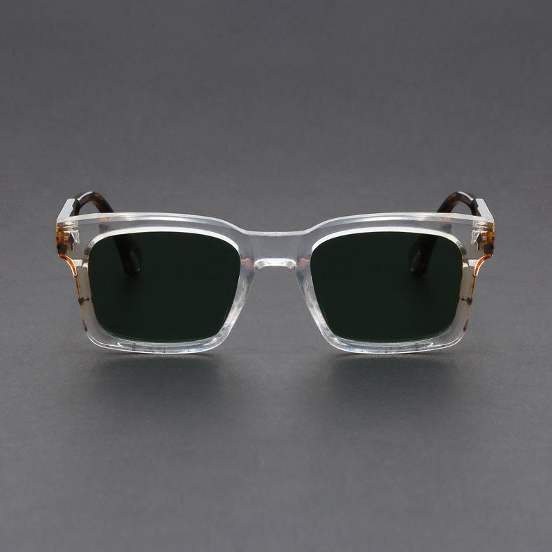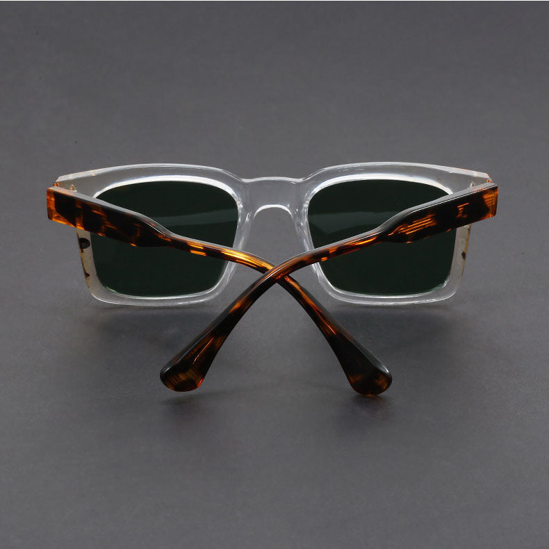 The clear-to-tortoiseshell gradient frame is engineered with precision-molded acetate, delivering bold contrast and structure in a single silhouette. Thick rectangular rims and deep green lenses create a sharp visual statement with functional edge.