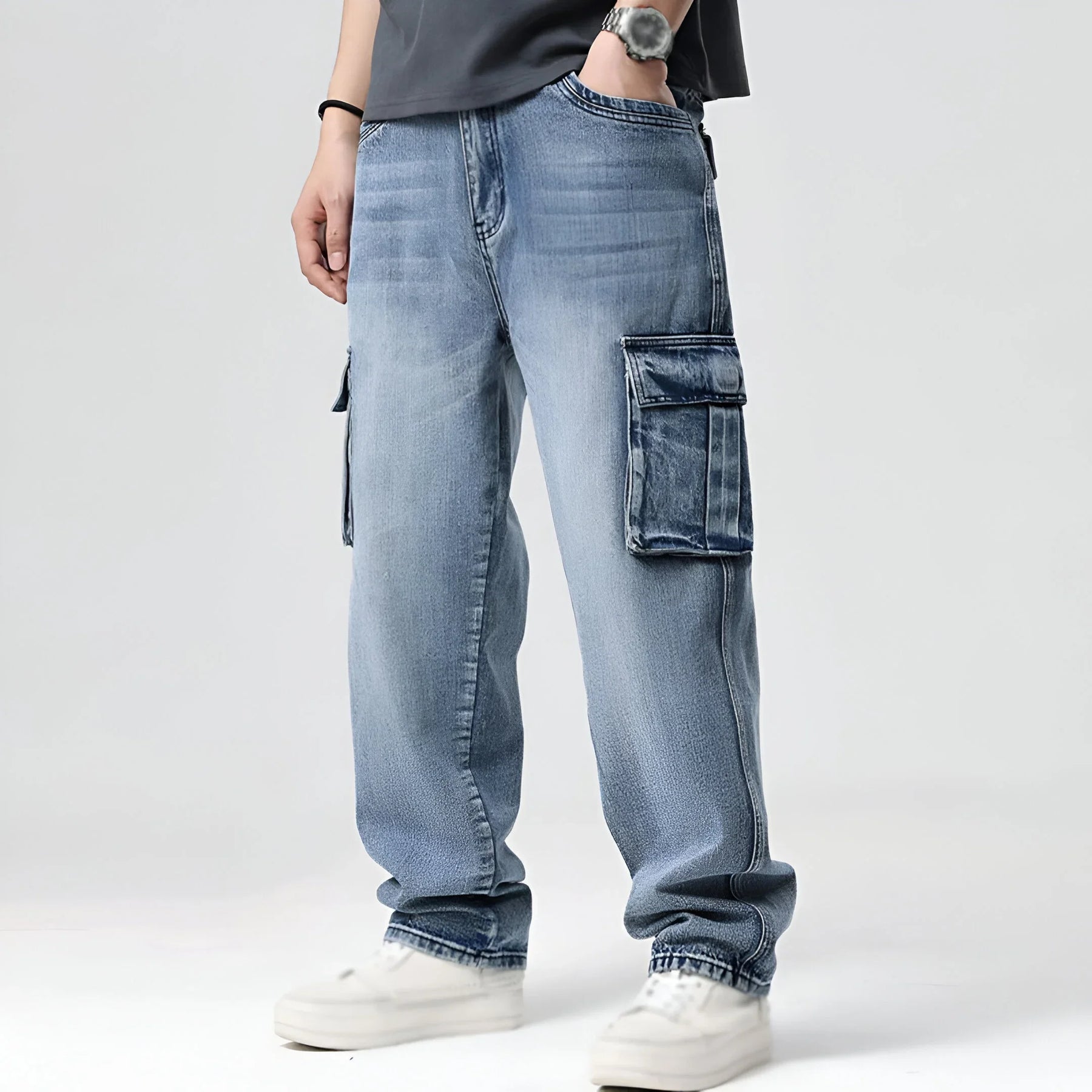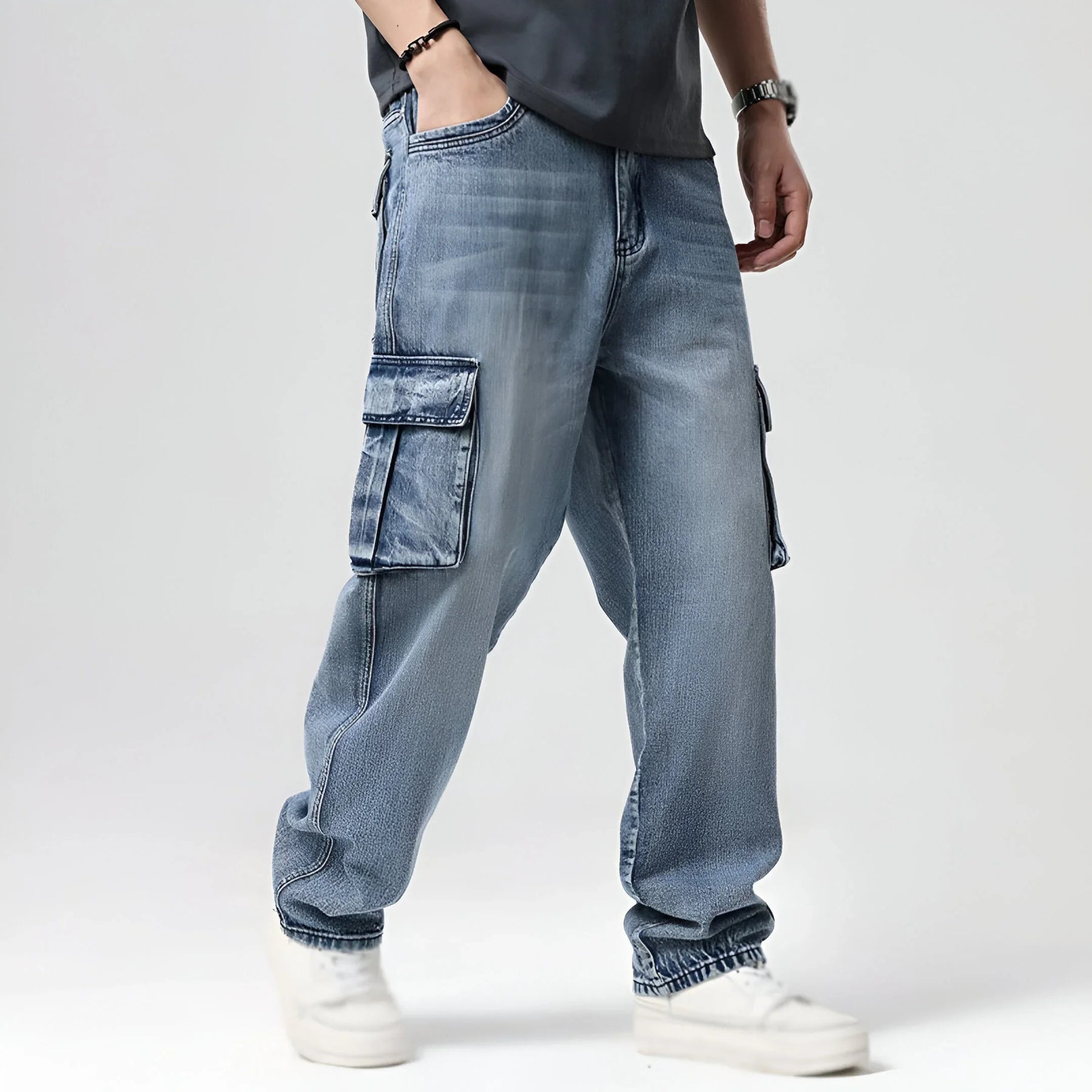 Premium‑crafted, stone‑washed cotton denim delivers a soft hand and lived‑in depth. A relaxed silhouette is engineered with signature oversized cargo pockets and reinforced seams for high‑performance durability. Subtle taper keeps the line clean and modern.